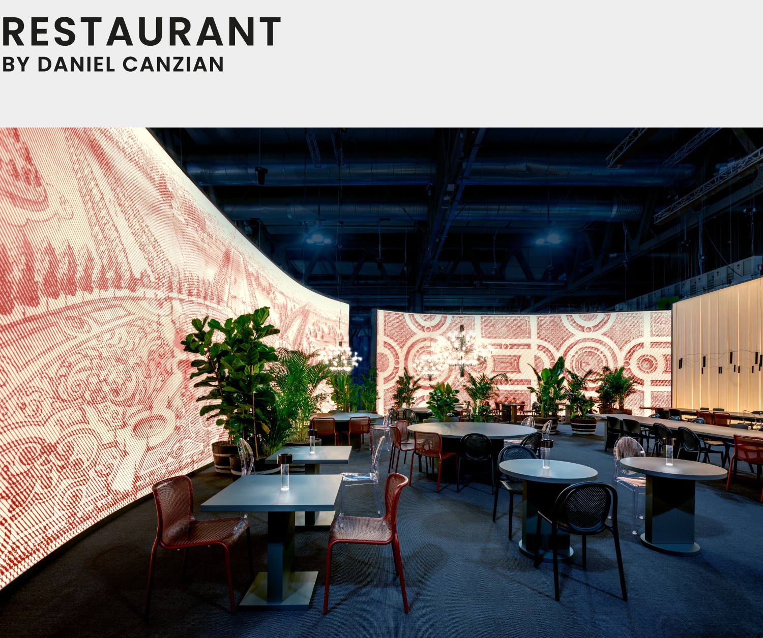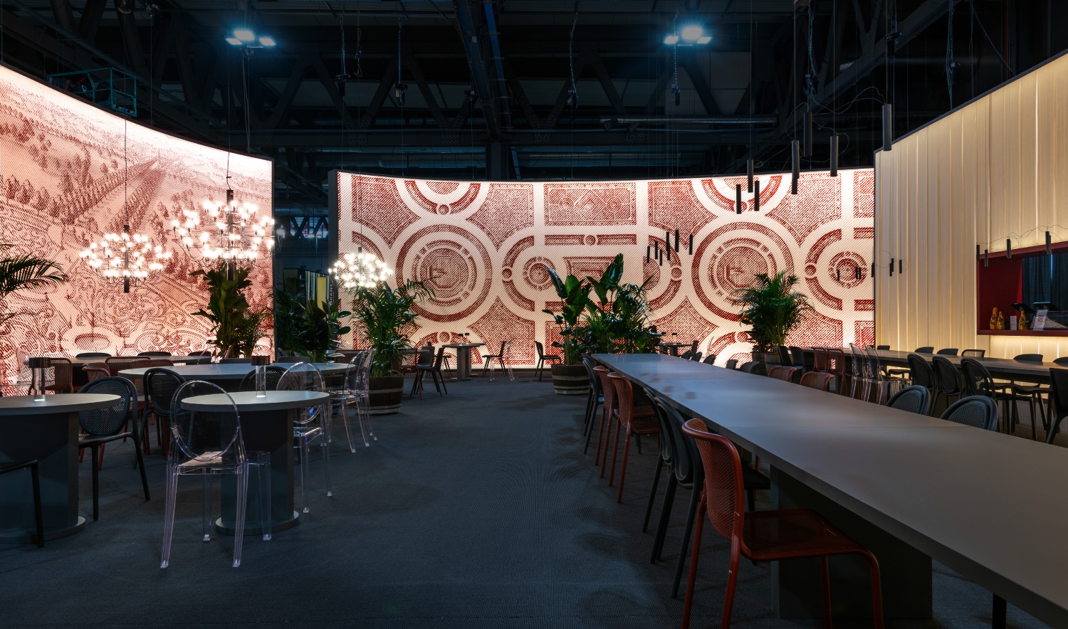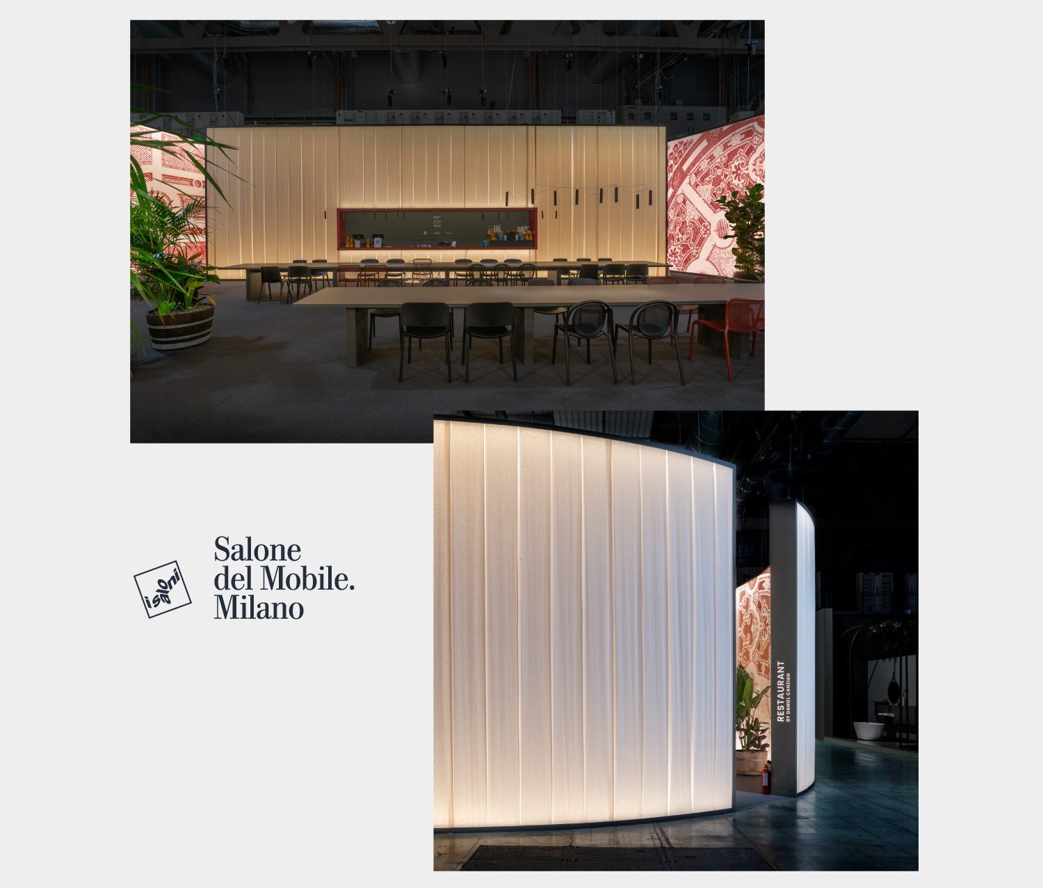 Progetto realizzato per Lissoni & Partners / Lissoni Graphx Milano: progetto grafico dell'allestimento della Red Lounge e il ristorante International Bathroom Exhibition. Salone del Mobile, Milano Design Week. 2024