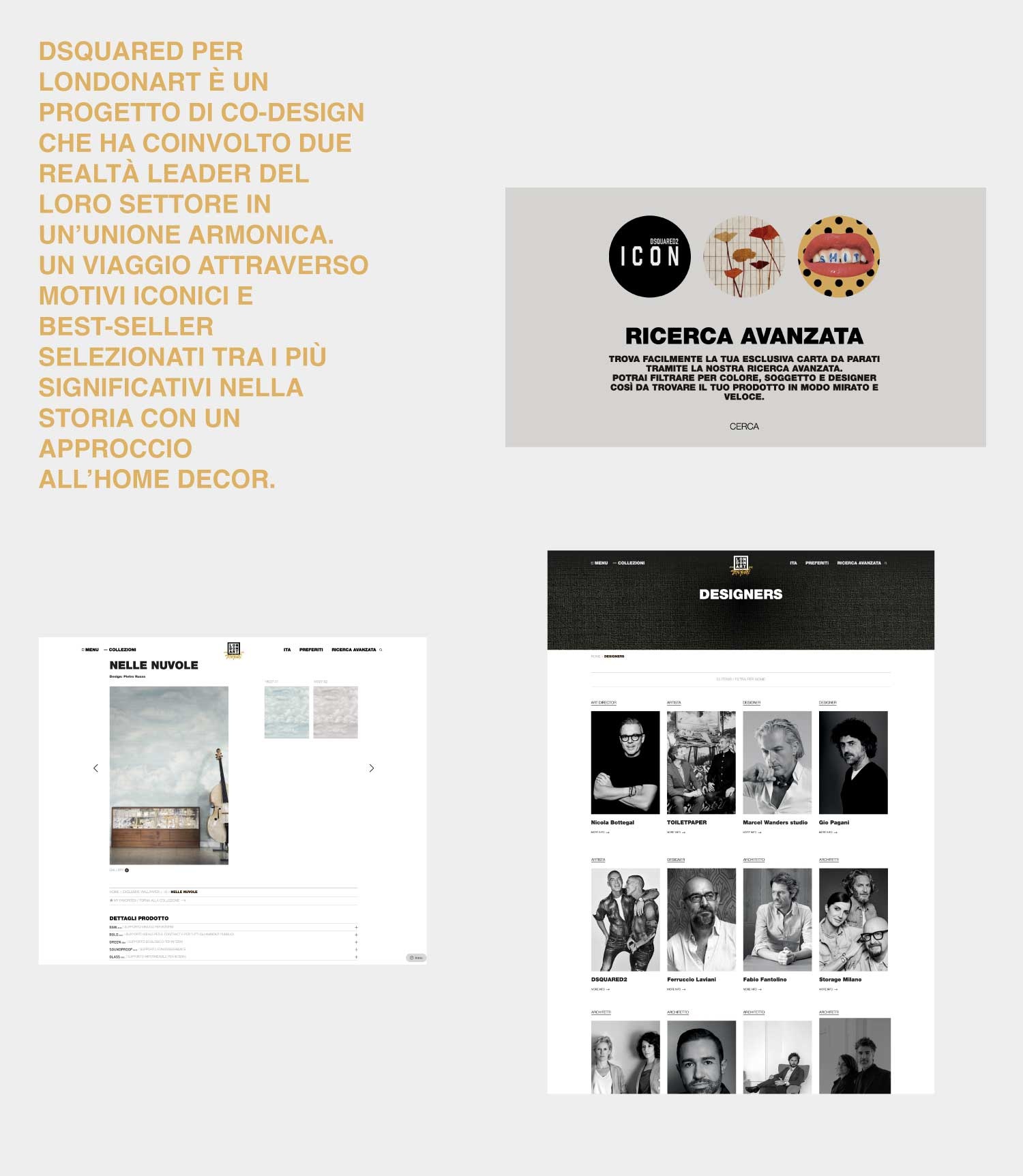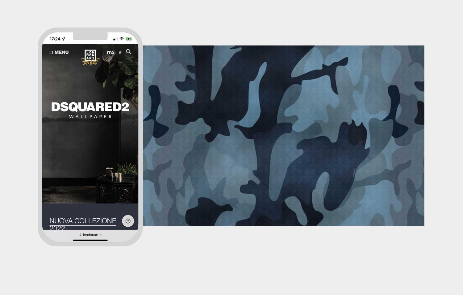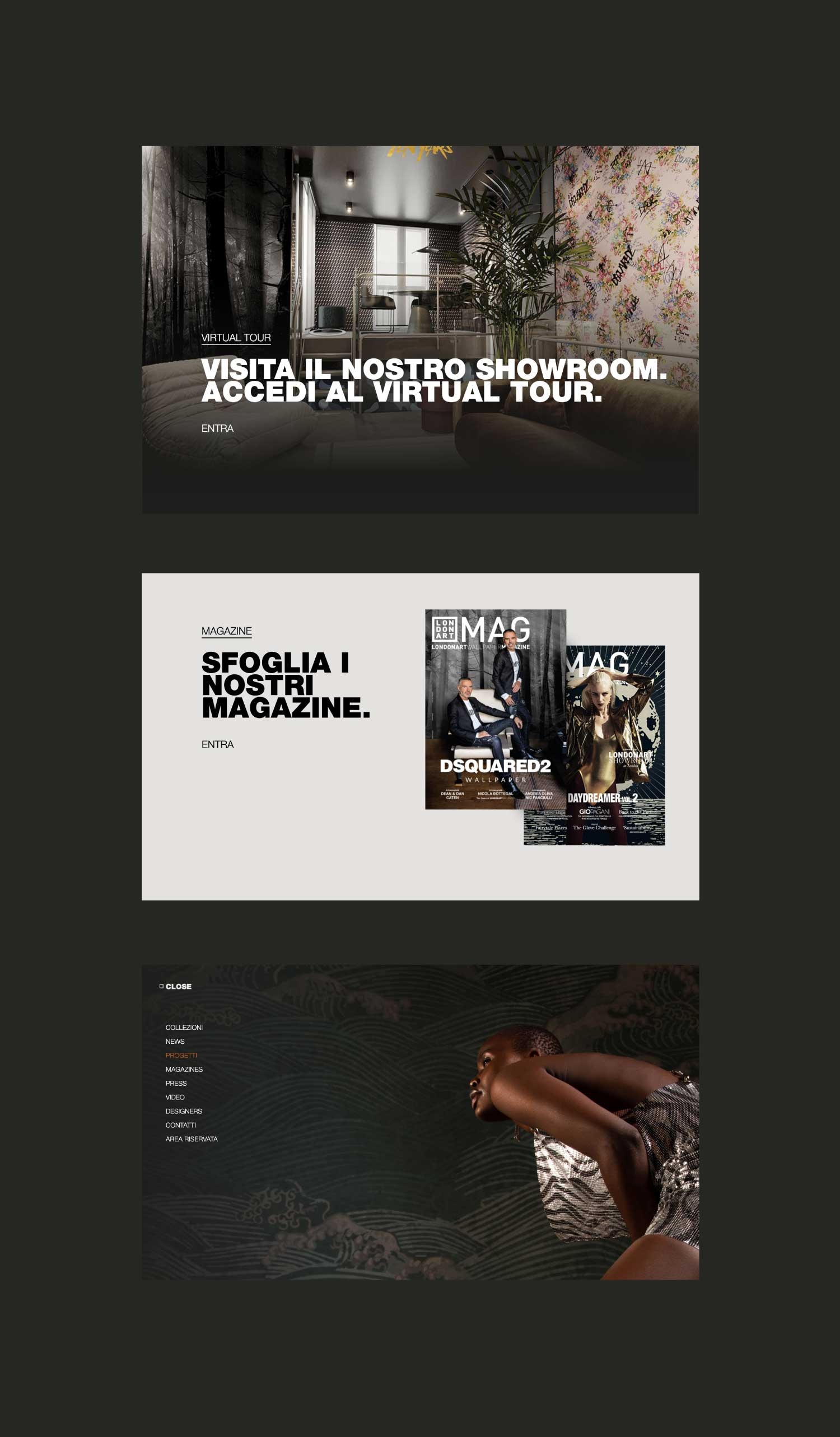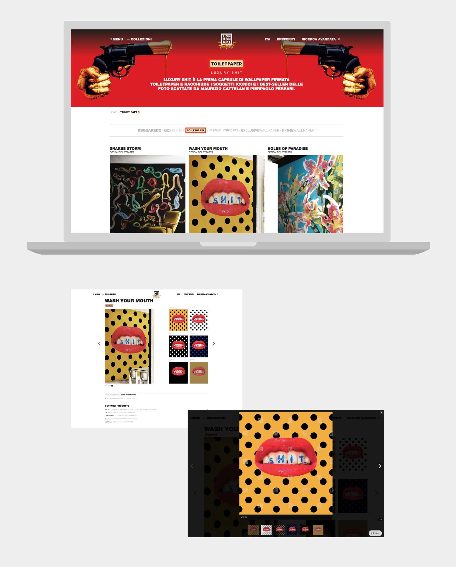 Progettazione e art direction, user interface user experience del nuovo sito Londonart Wallpaper. Coordinamento della programmazione e del data entry con web agency. 2022. www.londonart.it