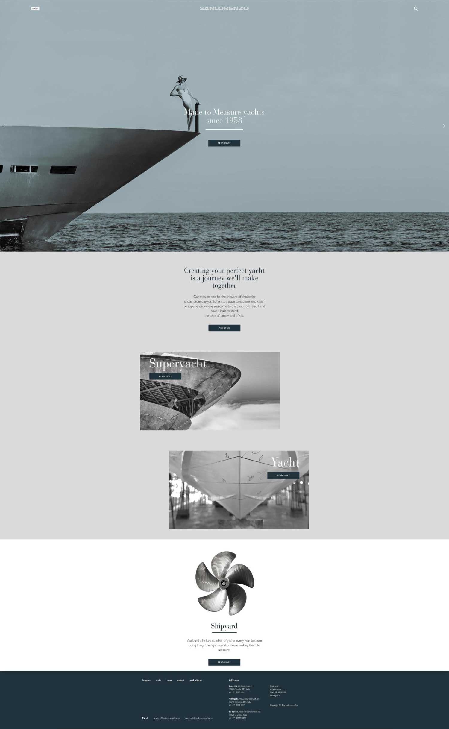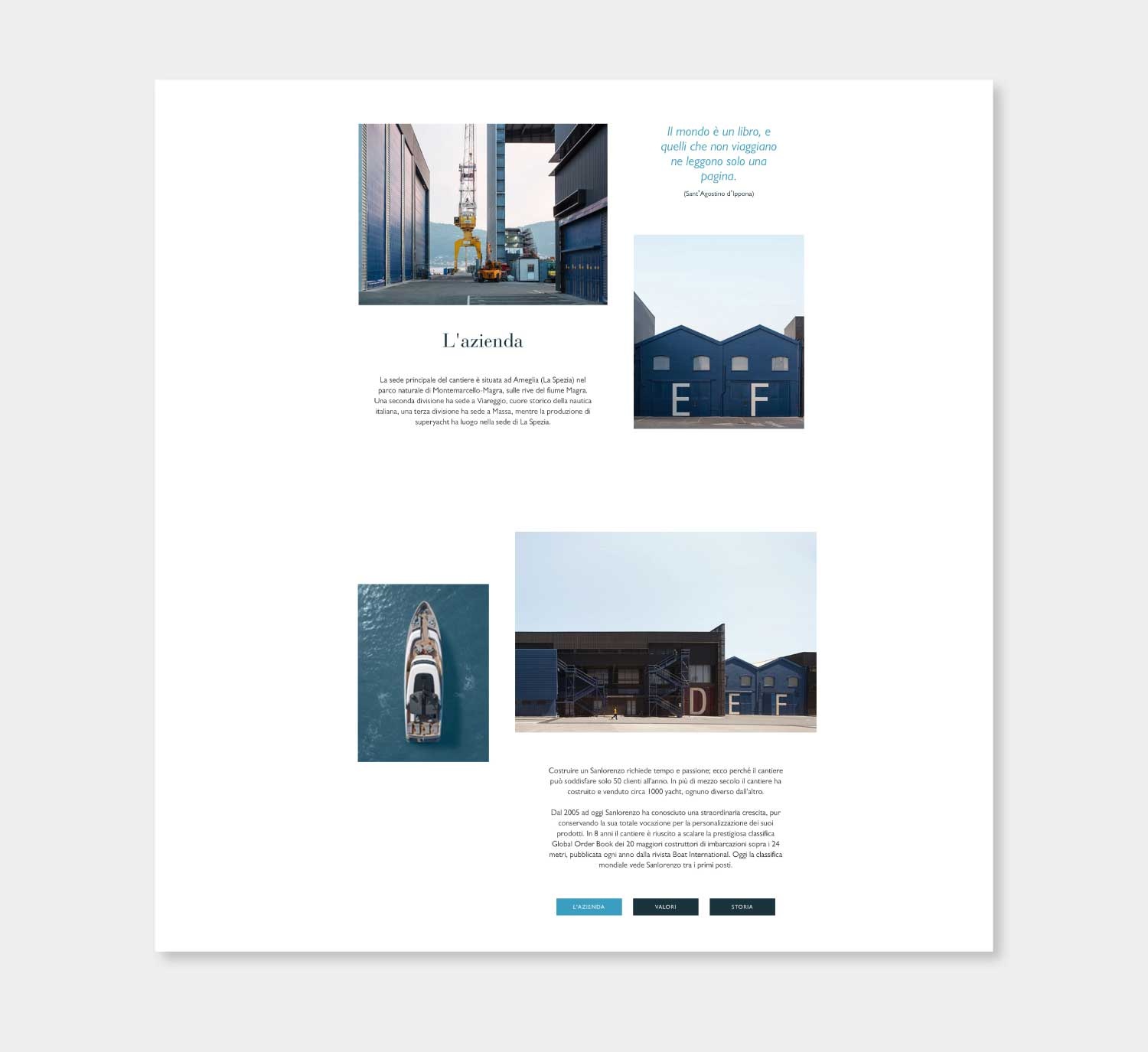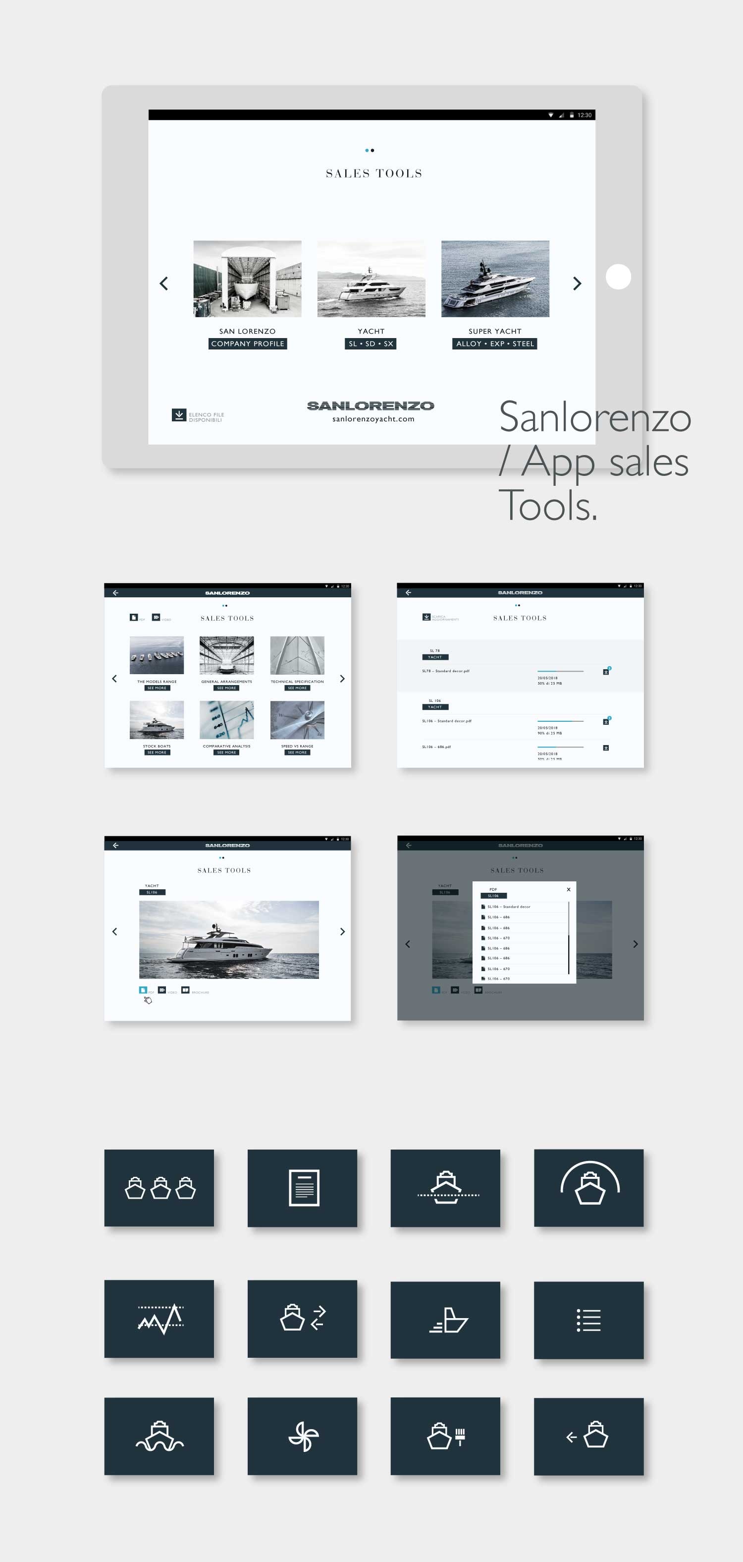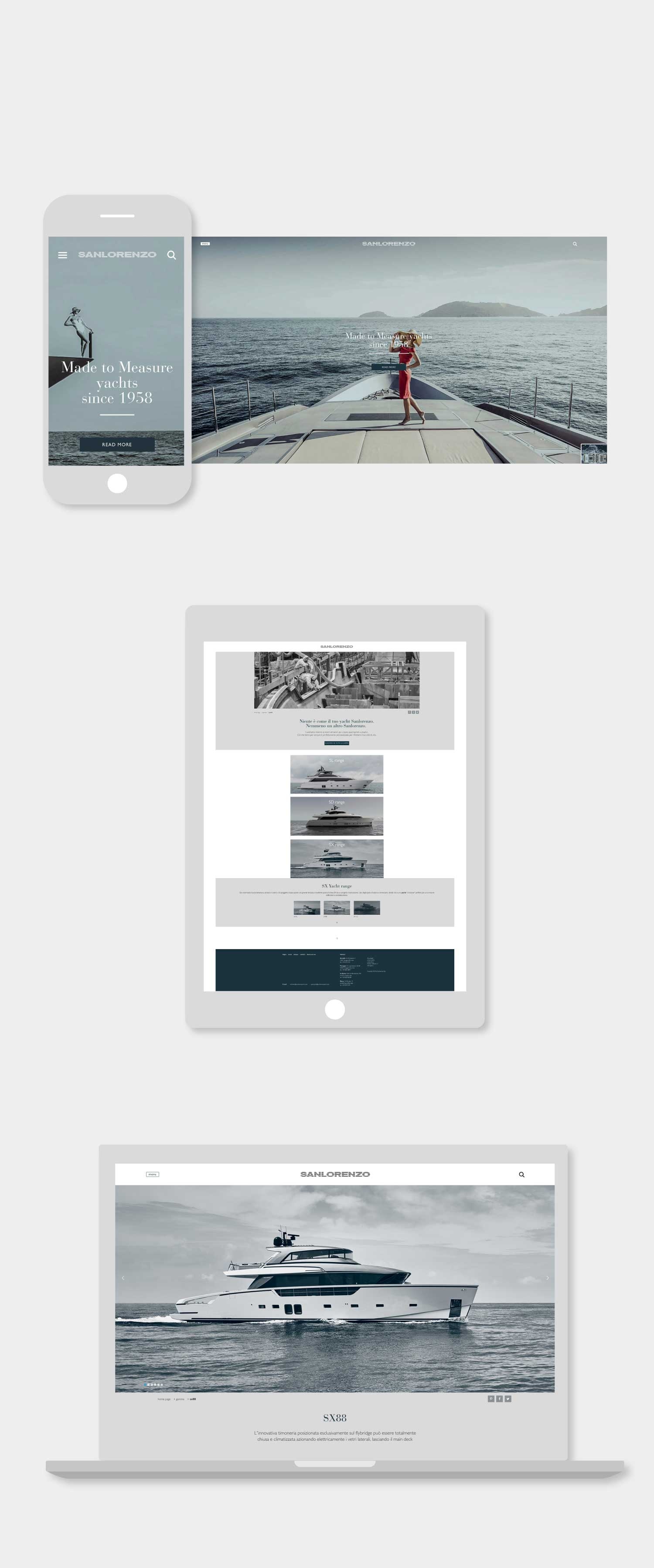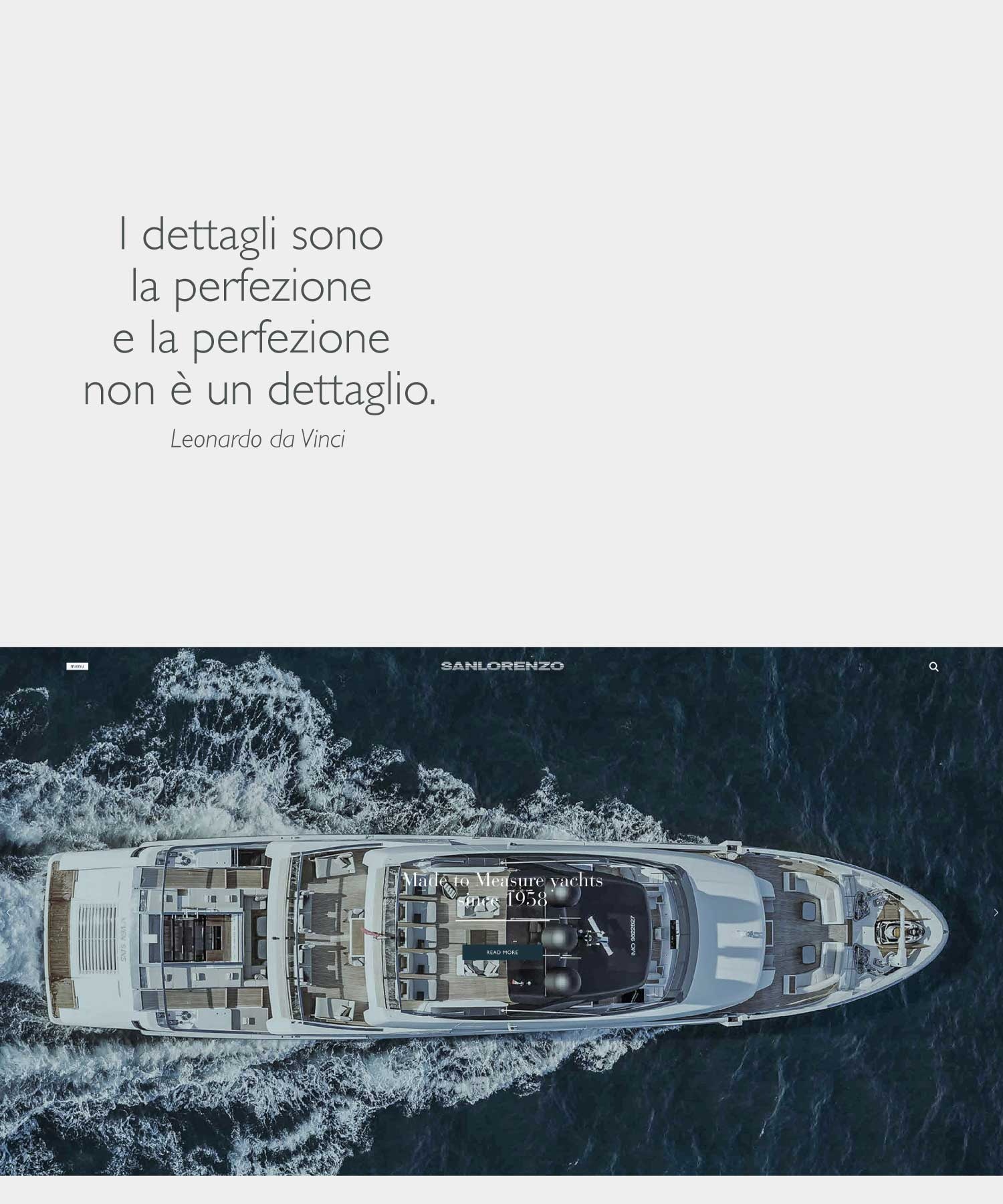 Progetto realizzato per Lissoni & Partners / Lissoni Graphx Milano: Progettazione e creatività web design e user experience del nuovo sito Sanlorenzo yacht e superyacht. Creatività e sviluppo per App sales tools. Creatività e coordinamento sviluppo per cataloghi digitali e biblioteca digitale. Coordinamento della programmazione e del data entry con web agency. 2018/2022 Creatività e coordinamento per profili social 2018/2019